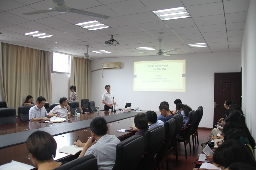 周统权教授主要围绕“如何写出高水平论文的经验与建议”以及“如何撰写项目申报书”两部分内容展开。周教授从写作动机、文献的搜集与阅读、批判性阅读习惯的养成以及如何选择对口期刊、如何对待专家修改意见等方面深度剖析了高水平论文所具有的特点并介绍了撰写高水平论文的方法。周教授认为,一篇高水平学术论文的形成需要老师们多读书、广积累,勤练笔、说“行家话”,打磨文章、建立学术自信,认真对待专家反馈的修改意见。随后,他系统讲解了项目申报书的选题、研究意义与价值、研究内容、思路与方法和项目团队软实力等问题,并结合自己项目申报丰富经验讲述了申报的技巧与关键点。他还着重针对语言学、文学和翻译三个方向为学院老师申报项目提出了细致而宝贵的意见。报告结束后,周教授和参会老师们就报告主题进行了交流与讨论,气氛热烈。徐以中教授希望学院师生进一步增强科研意识,主动参与到学院学术团队当中,拓展研究思路,积极申报国家社科基金等各类研究项目,为学院科研工作水平提升贡献力量。
