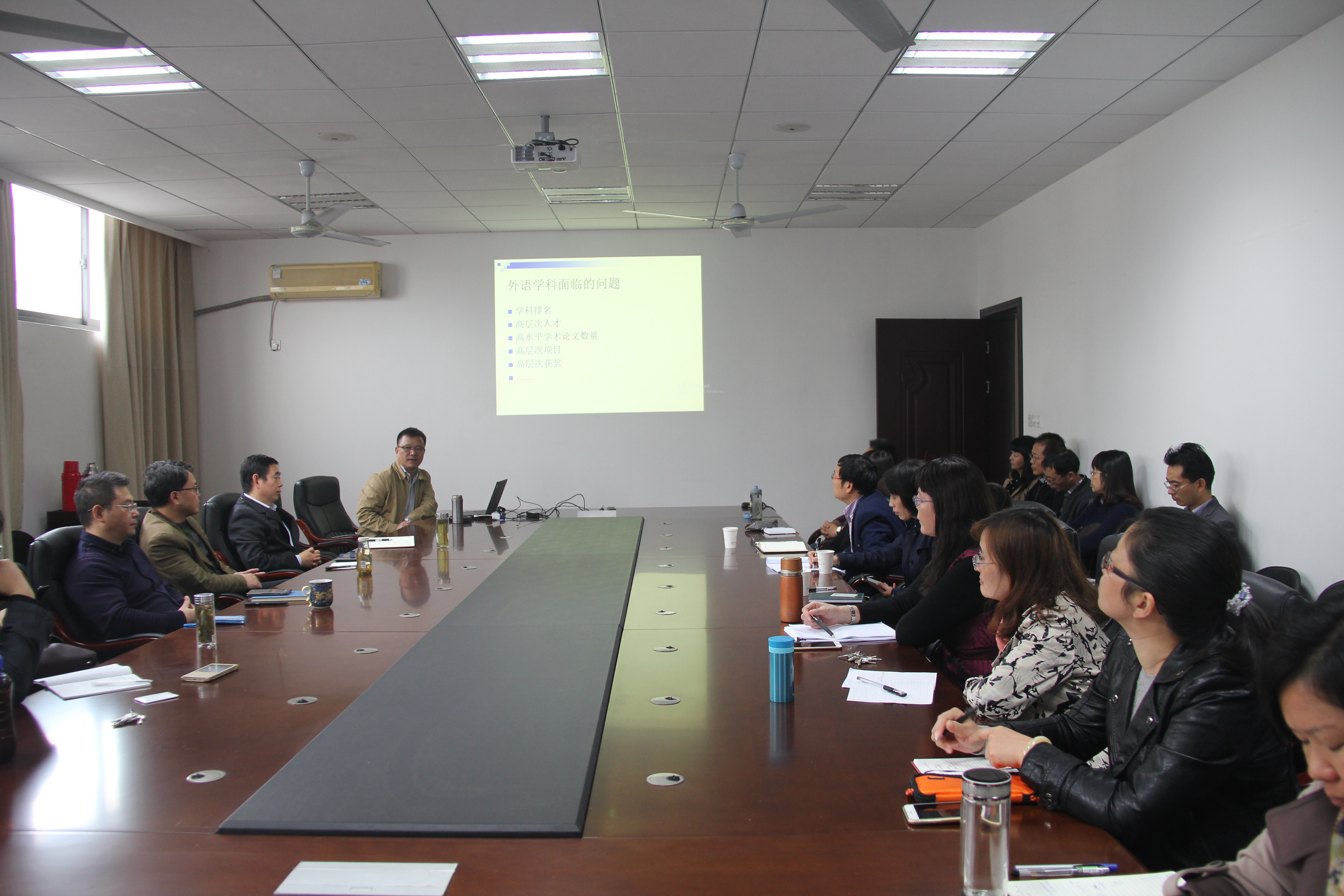 座谈会由院长范祥涛教授主持,首先回顾了365英国官网近年来的工作情况,肯定了学院在外语学科排名、高层次人才引进、高水平学术论文的发表、高层次项目的申报、高层次获奖等方面做出的努力和取得的成就,同时也指出了外语学科近几年来所面临的的问题。
