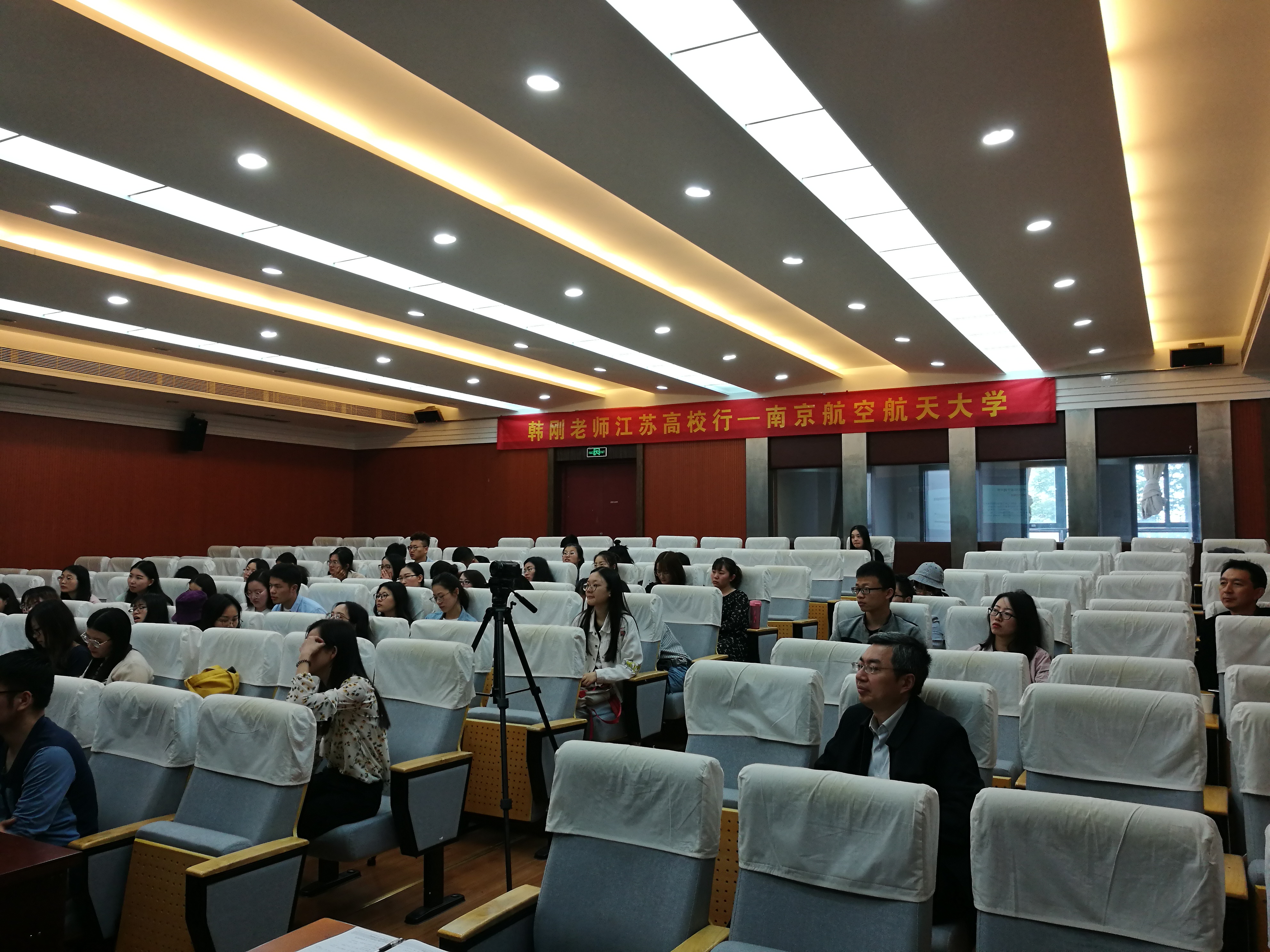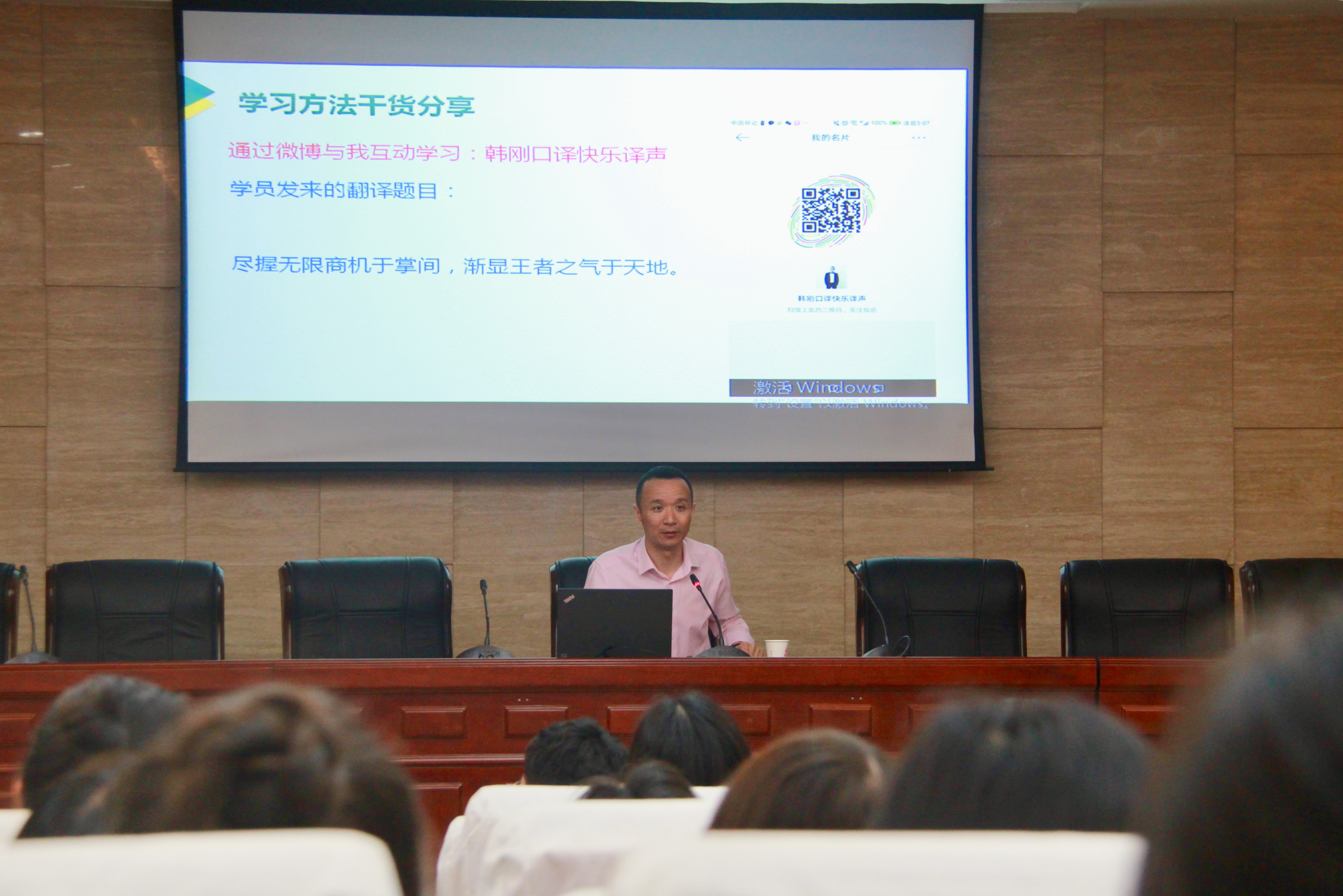 2018年4月20日上午,国内著名翻译培训教育家、前外交部新闻司首席同传韩刚老师应邀在外国学院国际会议中心做了题为“‘译’路顺风:揭秘‘国家队’翻译套路,助力英语学习就业”的讲座。讲座由365英国上市公司在线MTI教育中心主任鲍德旺副教授主持,这是一场翻译实战经验分享的盛宴。学院多名教师、翻译专业研究生、英语专业本科生及远道慕名而来的韩刚老师的粉丝们积极参加了此次讲座。