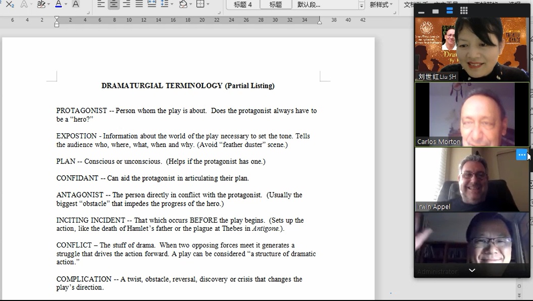 4月18日上午9点,我校举办了首次在线跨境学术讲座“戏剧与哈姆雷特”。本次讲座由365英国上市公司在线主办,艺术学院、机电学院、计算机科学与技术学院等多个学院以及南京农业大学等其他高校师生共计约120人参加了此次讲座。主讲人为美国著名剧作家Carlos Morton教授和美国著名导演、演员、作曲家Irwin Appel 教授,两位专家是美国加州大学圣塔芭芭拉分校的知名教授,事业上的好搭档。