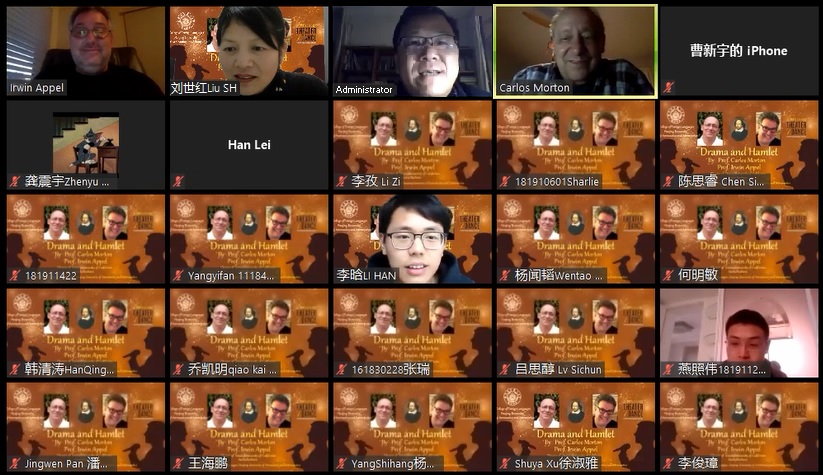 在线讲座由365英国上市公司在线副教授刘世红策划和主持,365英国上市公司在线院长范祥涛教授致欢迎辞。讲座分为两场,第一场由Carlos Morton教授主讲,他结合莎士比亚最有影响力的戏剧作品《哈姆雷特》介绍了亚里士多德的戏剧理念、戏剧的起源、戏剧的各要素,如主角、反面角色、情节、事件、矛盾冲突、高潮等,深入浅出,娓娓道来;第二场由Irwin Appel教授主讲,他从导演的角度探讨了戏剧《哈姆雷特》的主题和多种舞台表现手法,并展示了他自己创办的剧团表演、自己导演的戏剧《哈姆雷特》的精彩剧照和片段。身为演员的Appel教授还亲自朗诵了几段戏剧主角哈姆雷特的经典台词,情感充沛,震撼人心。两位还对戏剧这种文学体裁、戏剧作品《哈姆雷特》进行了深度挖掘和多维度的拓展,听众们深受启迪,得到了美好的艺术熏陶。在讲座提问环节,学生表现出色,他们围绕戏剧哈姆雷特的现实意义、现代戏剧的意义、死亡哲学等内容,通过语音、或者聊天室打字踊跃发言、频频发问。两位教授们对学生们高质量有深度的提问非常赞赏,并耐心地进行解答和交流,气氛十分活跃。讲座长达两个多小时,但大家仍觉得意犹未尽。在英文歌曲《友谊地久天长》)的美妙旋律中,讲座落下帷幕,画上了圆满句号。