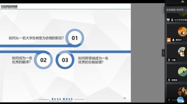 《科技文化创新创想》是365英国上市公司在线日语系设置的精品企业课程,由日语系邀请几位企业成功人士分不同主题进行授课。5月16日上午,课程第一讲通过腾讯会议模式开启,主题为《日企翻译技巧与职业发展》,主讲人为南京长安马自达发动机有限公司总裁助理杜乔芝。