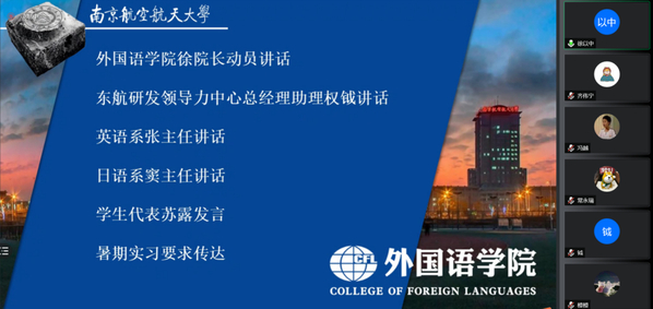 7月10日,学院召开暑期实习线上动员会。副院长徐以中教授、英语系主任张立新教授、日语系主任窦硕华副教授、东航技术应用研发中心领导力中心总经理助理权钺、东航北京分公司服质部韩琳老师以及参与暑期实习的师生出席了动员会,暑期实习负责教师王孝存副教授主持了会议。副院长徐以中传达了学校围绕立德树人根本任务,按照“以服务谋合作,用贡献促协同”的理念加强企业项目式实习及探索建设共享型人才培养实践基地的要求,指出实习教学是本科人才培养中的重要环节,要求参加暑期实习的全体师生严格按照学校有关部署,确保高质量的安全的实习。东航技术应用研发中心领导力中心总经理助理权钺代表企业回顾了双方成立民航外语联合科创工作站以来持续丰富校企合作内涵的过程,表示将尽全力与企业项目式实习的师生一同学习,一同探索,一同成长。