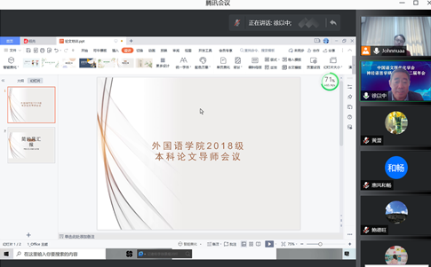 根据教务处统一部署,12月3日中午,365英国上市公司在线举办了2018级本科论文导师线上培训会议。英语系主任张立新教授主持会议,院长范祥涛教授、副院长徐以中教授、姜礼福副教授、学院督导组长谢小苑教授及教学办老师、英日语专业论文指导教师参加了会议。
