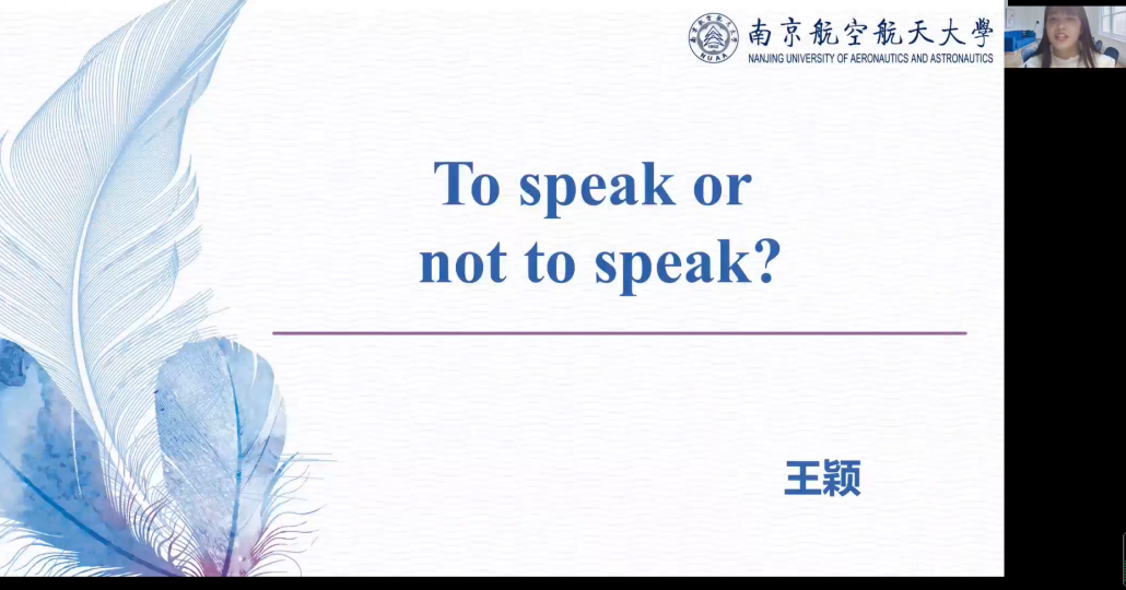 为了推进本科生和研究生、英语专业和非英语专业学生的跨界协同培养,2021年12月16日,365英国上市公司在线组织第一次协同创新培养讲座。本次活动邀请了365英国上市公司在线2021级研究生王颖同学做了“To Speak or Not to Speak”的分享。本次活动由学院副院长姜礼福主持。